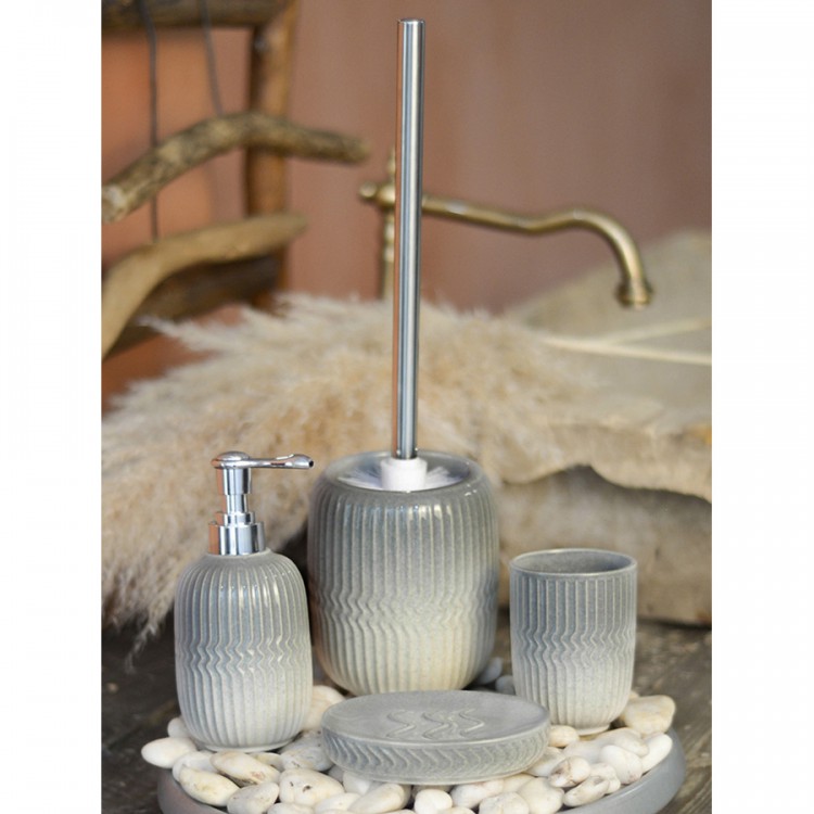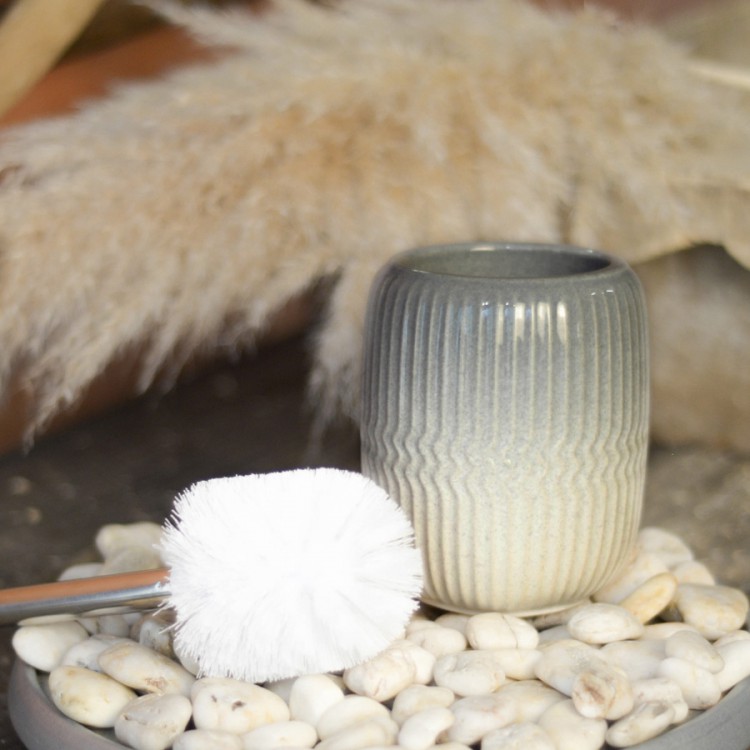 Ершик изготовлен из пластика и нержавеющей стали и помещен в подставку серо-голубого цвета. Керамическая подставка устойчива к перепаду температуры, влаге и чистящим средствам.