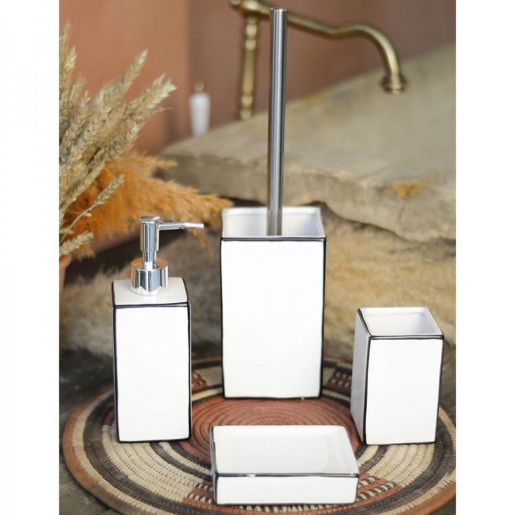 Ершик черного цвета помещен в контрастную белую подставку. Плоское основание подставки позволяет ей устойчиво размещаться на любой поверхности. Чаша изготовлена из прочного керамического стекла, гигиенична и устойчива к воздействиям влажной среды.