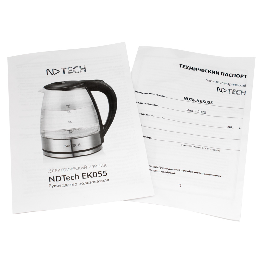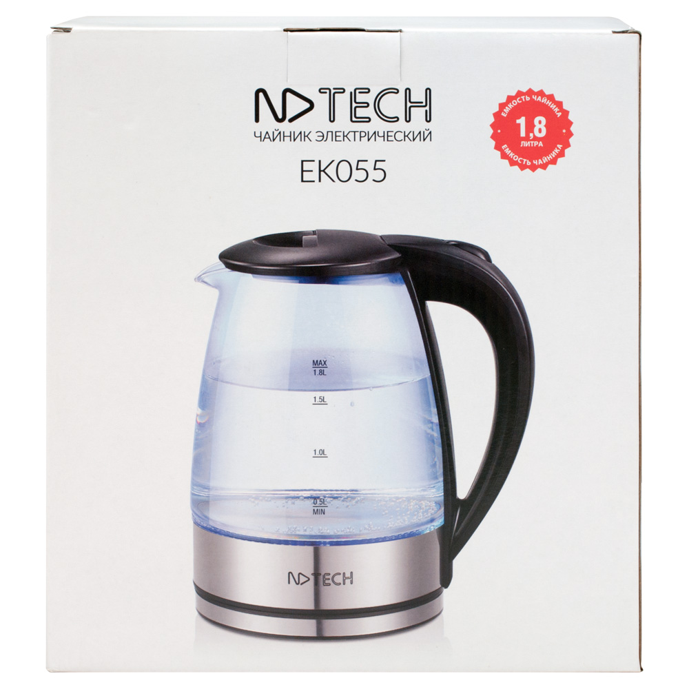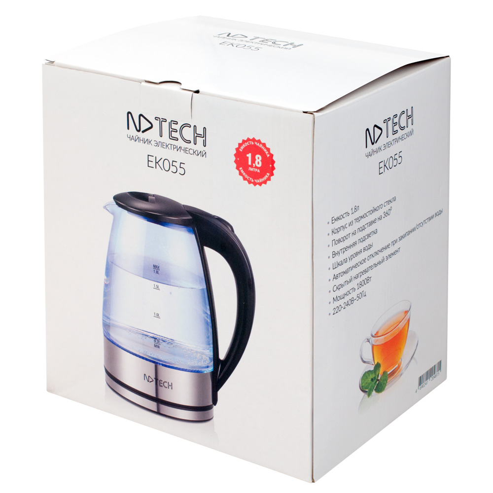 Чайник электрический NDTech EK055 с корпусом из термостойкого стекла, имеет светодиодную подсветку, которая включается при кипячении воды. Мощность 1800 Вт. Объем чайника – 1,8 литра. Нагревательный элемент установлен внутри конструкции. Он скрытого типа, защищен от внешних воздействий.