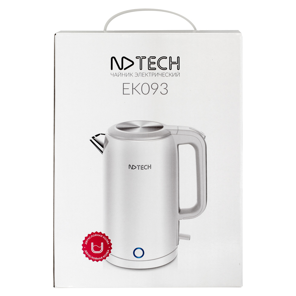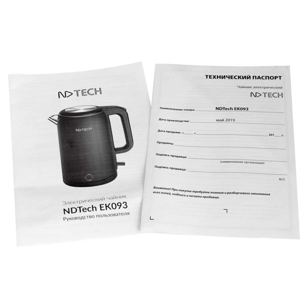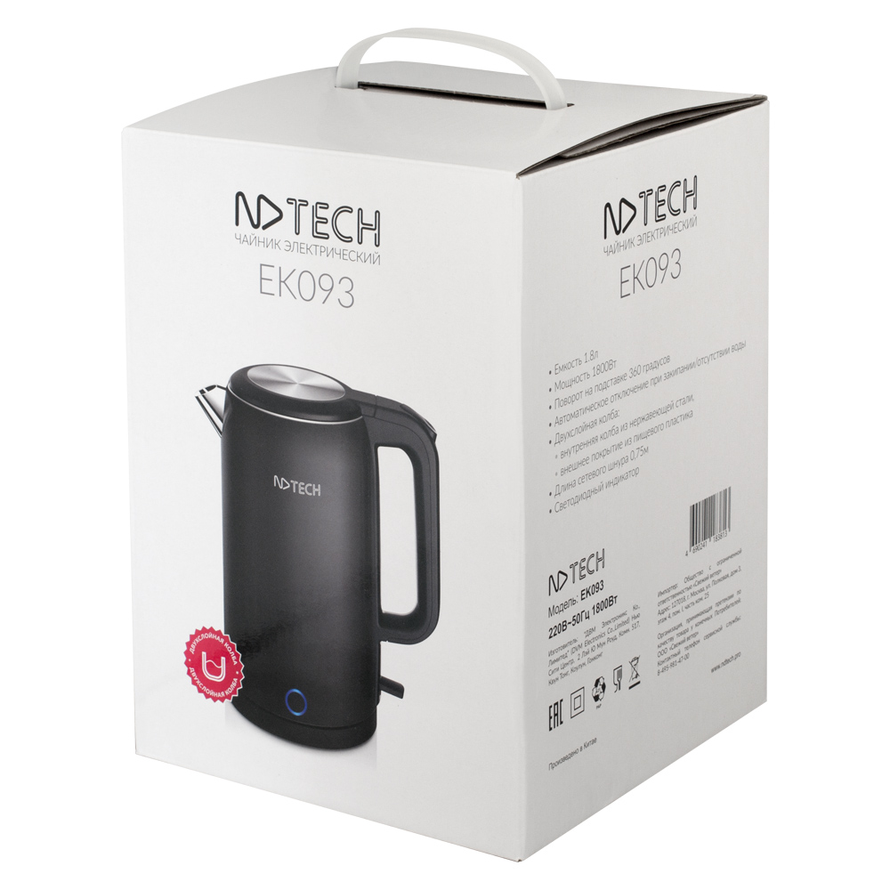 Электрочайник NDTech EK093 поможет вскипятить воду, приготовить чай или кофе. Он изготовлен с применением качественных компонентов. Модель надежная, способна прослужить вам в течение длительного времени, имеет мощность 1800 Вт. Объем чайника оптимальный – 1,8 литра. Корпус изготовлен с применением нержавеющей стали и пластика. Нагревательный элемент установлен внутри конструкции. Он скрытого типа, защищен от внешних воздействий.