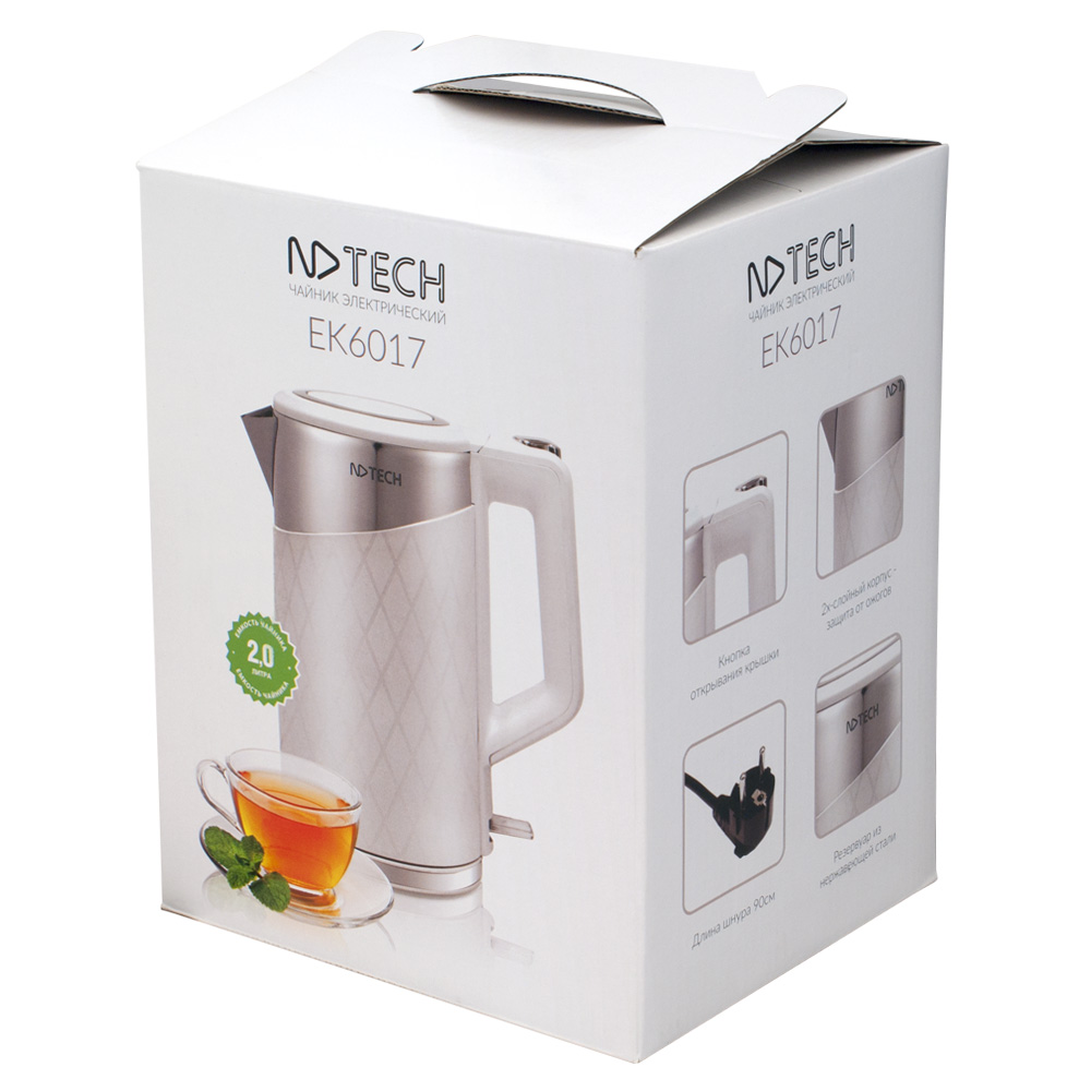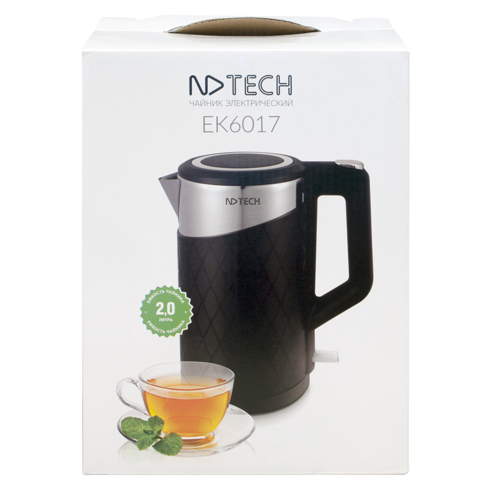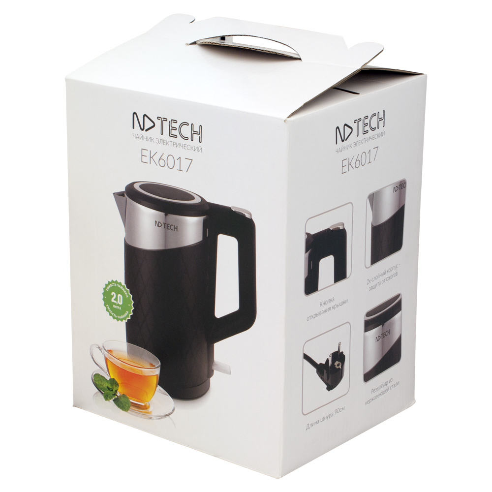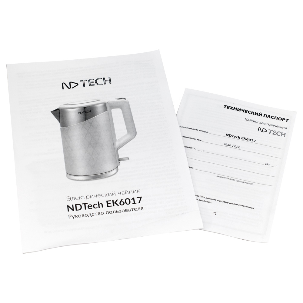 Электрочайник NDTech EK6017 поможет вскипятить воду, приготовить чай или кофе. Он изготовлен с применением качественных компонентов. Модель надежная, способна прослужить вам в течение длительного времени. Электрочайник NDTech EK6017 имеет мощность 1800 Вт. Объем чайника оптимальный – 2 литра. Можно вскипятить большое количество воды. Корпус изготовлен с применением нержавеющей стали и пластика. Металл не покрывается следами ржавчины при эксплуатации. Нагревательный элемент установлен внутри конструкции. Он скрытого типа, защищен от внешних воздействий.